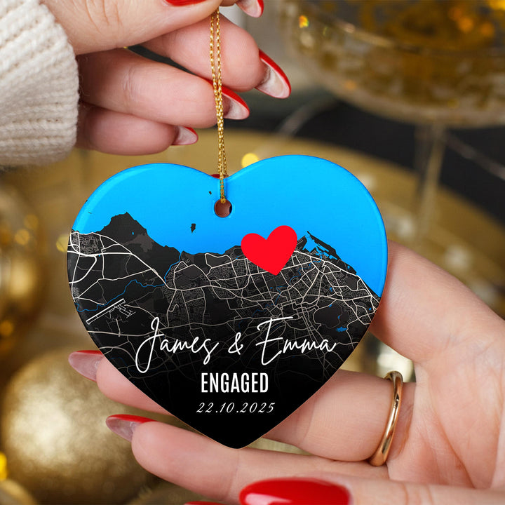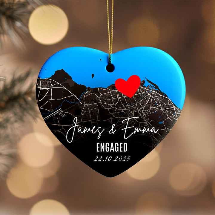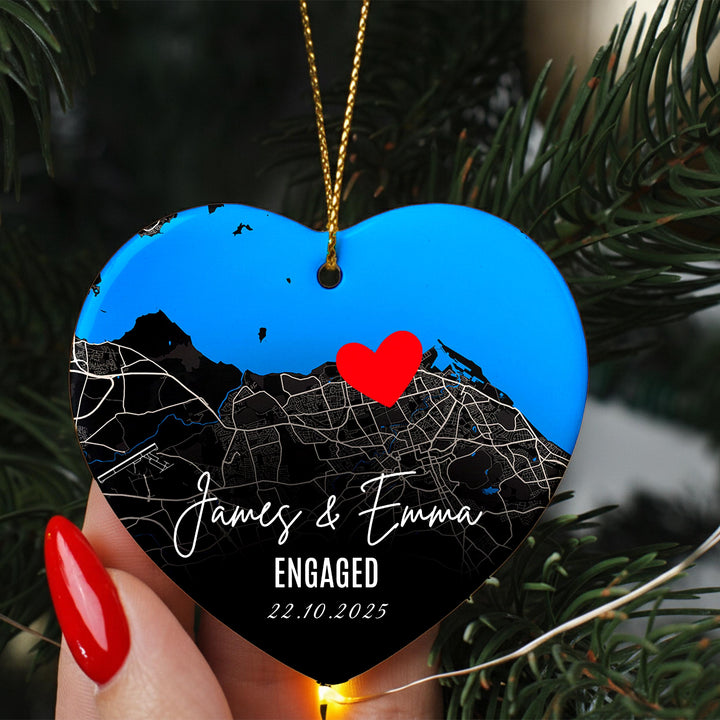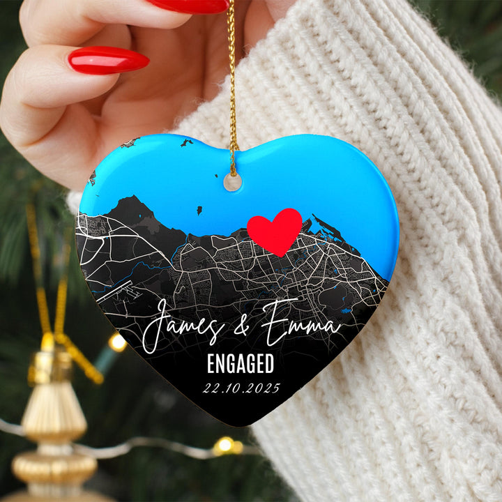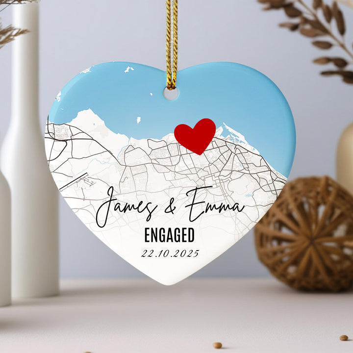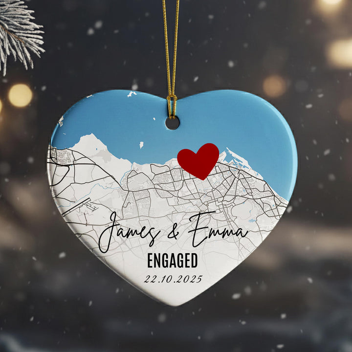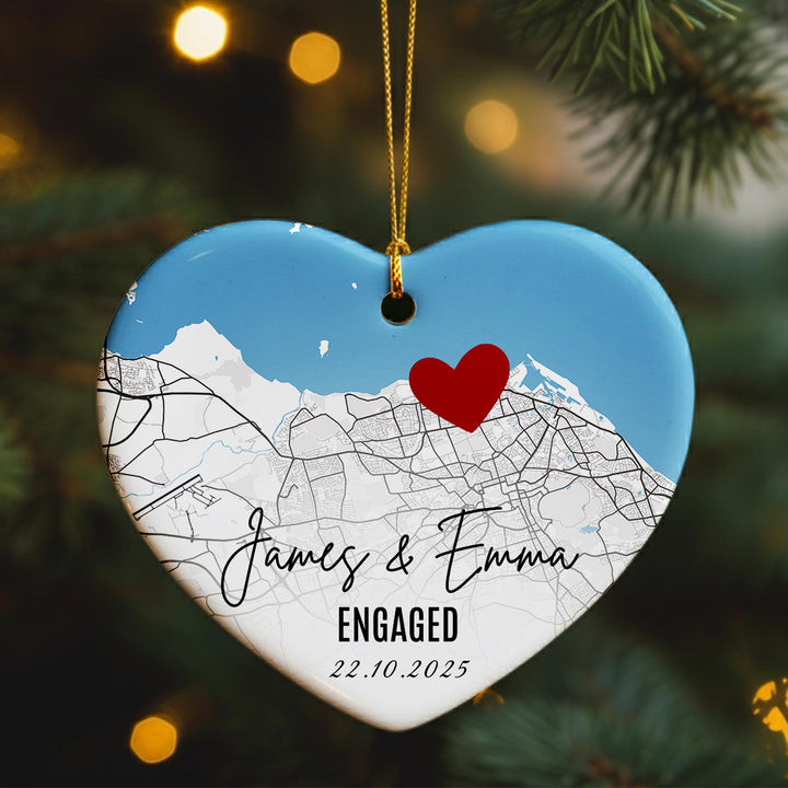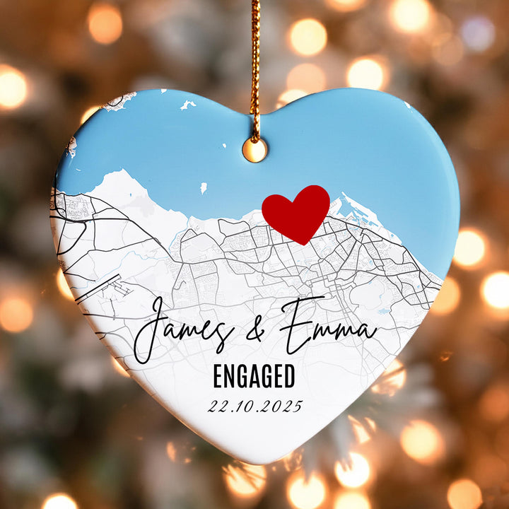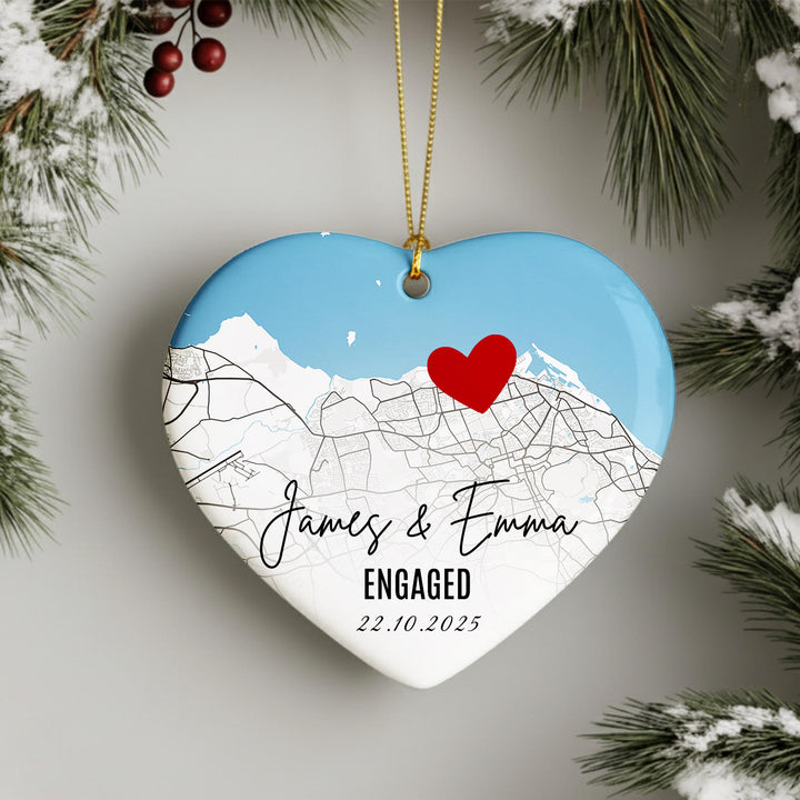 Personalised Engagement Map Ornament – Heart Ceramic Keepsake with Names & Date, Custom Location Gift for Couples, First Christmas Engaged