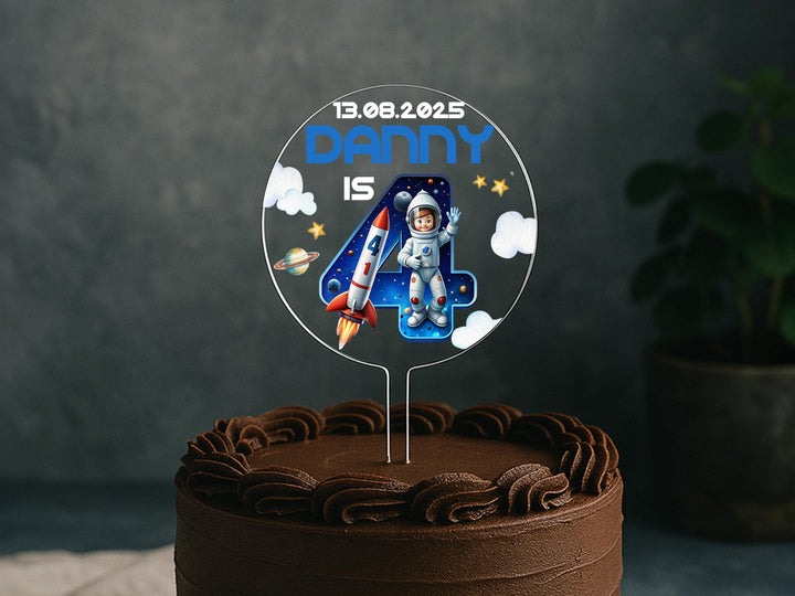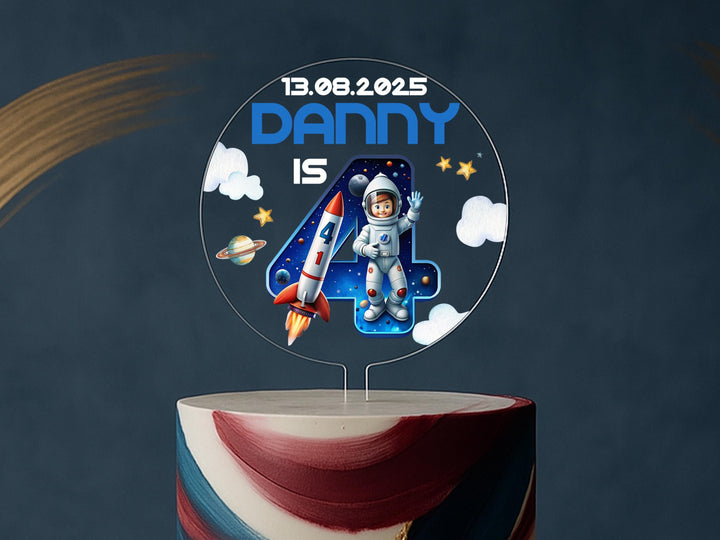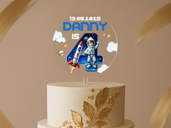 Celebrate your child's special day with our personalized space birthday cake topper, designed to bring the magic of the galaxy right to your party. This space birthday cake topper features a charming rocket, astronaut, planets, and stars, all customized with your child’s name, age, and party date to create a unique and memorable centerpiece. Crafted from premium 3mm clear acrylic, it offers vibrant colors and durable quality that lasts beyond the celebration.